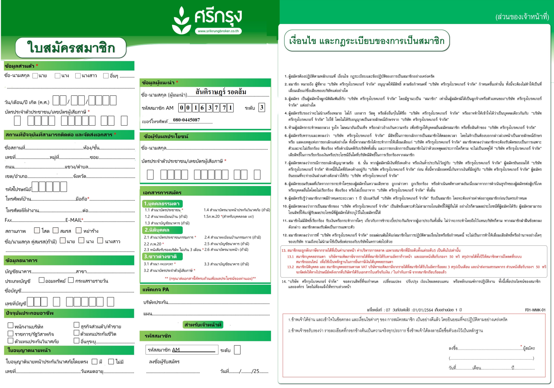 เอกสารที่ใช้ในการสมัครสมาชิก ศรีกรุงโบรคเกอร์