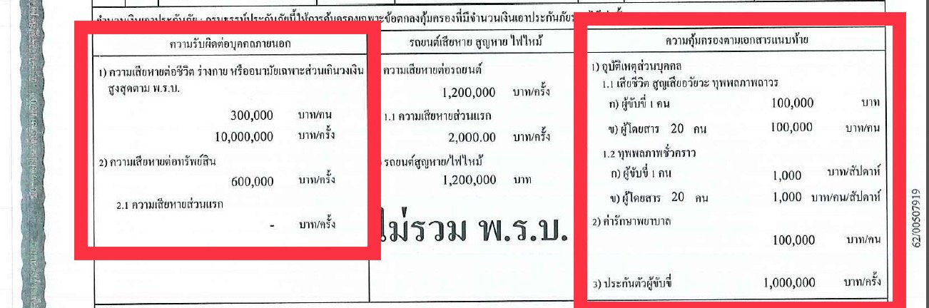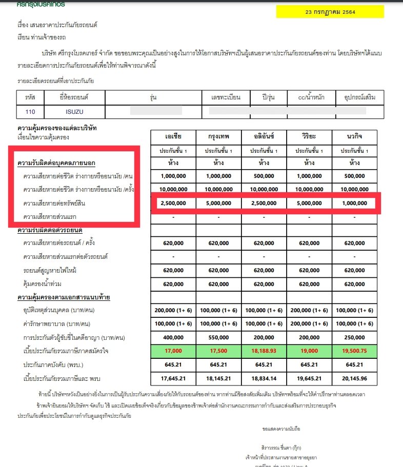 จะเห็นว่าทุนความคคุ้มครองของแต่ละบริษัทจะให้ไม่เท่ากัน วงเงินสูง เบี้ยสูง วงเงินต่ำเบี้ยต่ำ นี่คือการเลือกวงเงินความคุ้มครอง ต่อไปสังเกต ช่องที่ 2 ขวามือของตารางกรมธรรม์ หัวข้อ ความคุ้มครองตามเอกสารแนบท้าย หรือ ความคุ้มครองบุคคลภายในรถ จะมีวงเงินรักษา เสียชีวิต และ ประกันตัวผู้ขับขี่กรณีอาญา คือ กรณีที่เราขับรถชนคนตาย จะเป็นคดีอาญา ทางเจ้าหน้าที่ตำรวจจะควบคุมตัวใว้ก่อน สำหรับรถที่ไม่มีประกัน จะต้องนำเงินมาประกันตัว และสู้คดีเอง สำหรับรถที่มีความคุ้มครองประกันภัย บริษัทประกันจะนำเงินในส่วนความคุ้มครองนี้มาประกันตัวผู้และจัดหาทนายเพื่อสู้คดี โดยปกติเจ้าหน้าที่จะพิจารณาวงเงินประกันเริ่มต้นที่ 150,000-200,000 บาท ถ้าเลือกซื้อแผนประกันที่ให้ความคุ้มครองต่ำกว่า 150,000 ก็อาจไม่พอประกันตัวผู้ขับขี่ แต่ถ้าซื้อแผนที่ให้ทุนมากกว่า 200,000 บาท ก็จะทำให้เบี้ยประกันสูง เพิ่มเติม ถ้าคุณโชคร้ายขับรถชนคนตายตอน 16:00 ของวันศุกร์ หากคุณไม่มีเงินสด คุณอาจต้องถูกควบคุมตัวที่ห้องขังของสถานีตำรวจก่อน เพราะบริษัทประกันปิด และหยุดต่อเนื่อง เสาร์ อาทิตย์ ดังนั้น คุณ ศรีกรุง อรุณสวัสดี ผู้ก่อตั้งบริษัทศรีกรุงโบรคเกอร์ เล็งเห็นถึงความสำคัญ จึงให้รถทุกคันที่ซื้อประกันผ่านศรีกรุงโบรคเกอร์ เมื่อขับรถชนคนตาย โทรติดต่อหาเฮีย ศรีกรุง อรุณสวัสดี โดยตรงได้ตลอด 24 ชม โดยเฮีย ศรีกรุง จะนำเงินส่วนตัวมาประกันตัวผู้ขับขี่ให้ก่อน ไม่ต้องถูกควบคุมตัวในห้องขัง