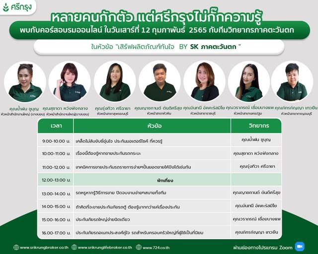 เสาร์นี้เรามีนัดกัน พบกับทีมหัวหน้าศรีกรุงภาคตะวันตก ที่ยกขบวนกันมาให้ความรู้และความสนุกกันผ่านโปรแกรม ZOOM แบบจัดเต็มเหมือนเดิม ห้ามพลาด