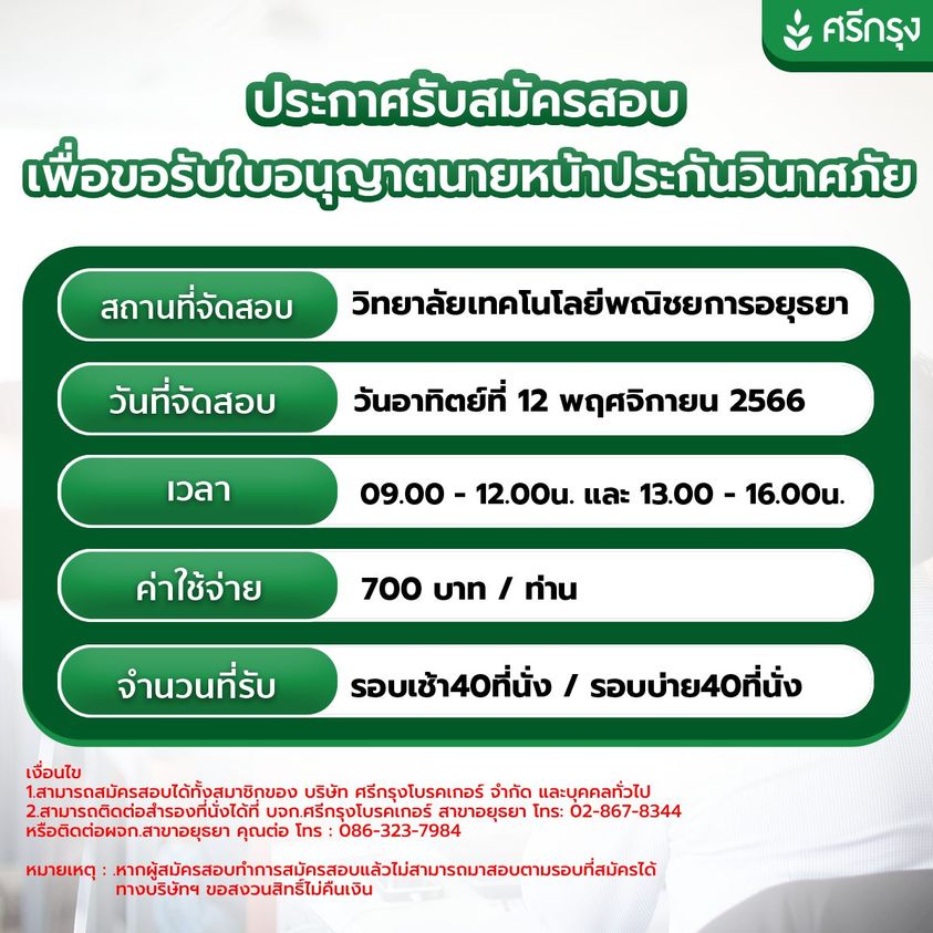 ศรีกรุงโบรคเกอร์ สาขาอยุธยา เปิดรับสมัครสอบบัตรนายหน้าประกันวินาศภัย (รอบพิเศษ)