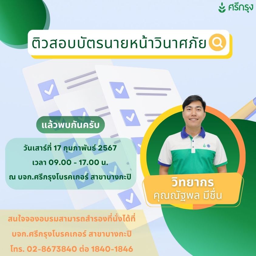 ด่วน ๆ ศรีกรุงโบรคเกอร์ สาขาบางกะปิ เปิดคอร์สติวสอบบัตรนายหน้า รีบจับจองที่นั่งกันได้เลยนะครับ
