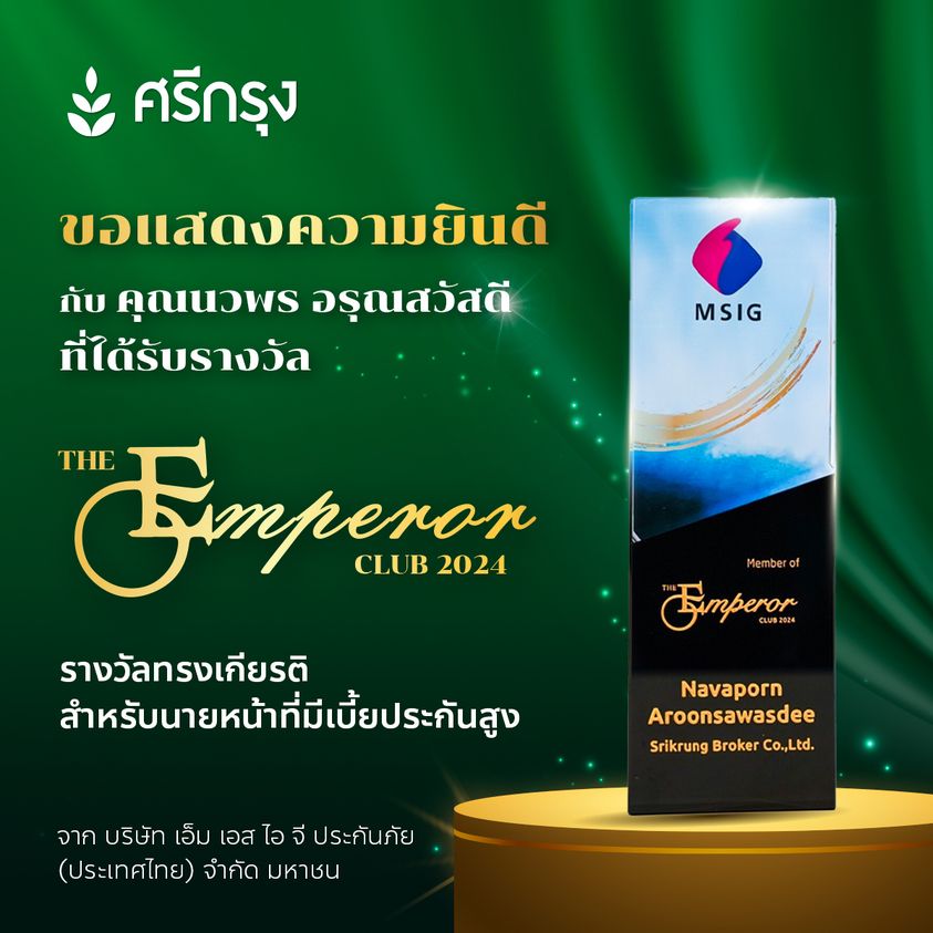 ขอแสดงความยินดีกับ คุณนวพร อรุณสวัสดี กรรมการบริหาร บริษัท ศรีกรุงโบรคเกอร์ จำกัด ได้รับรางวัล “The Emperor Club 2024” จาก บริษัท เอ็ม เอส ไอ จี ประกันภัย (ประเทศไทย) จำกัด (มหาชน) ซึ่งเป็นรางวัลอันทรงเกียรติ สำหรับนายหน้าที่มีเบี้ยประกันภัยสูง