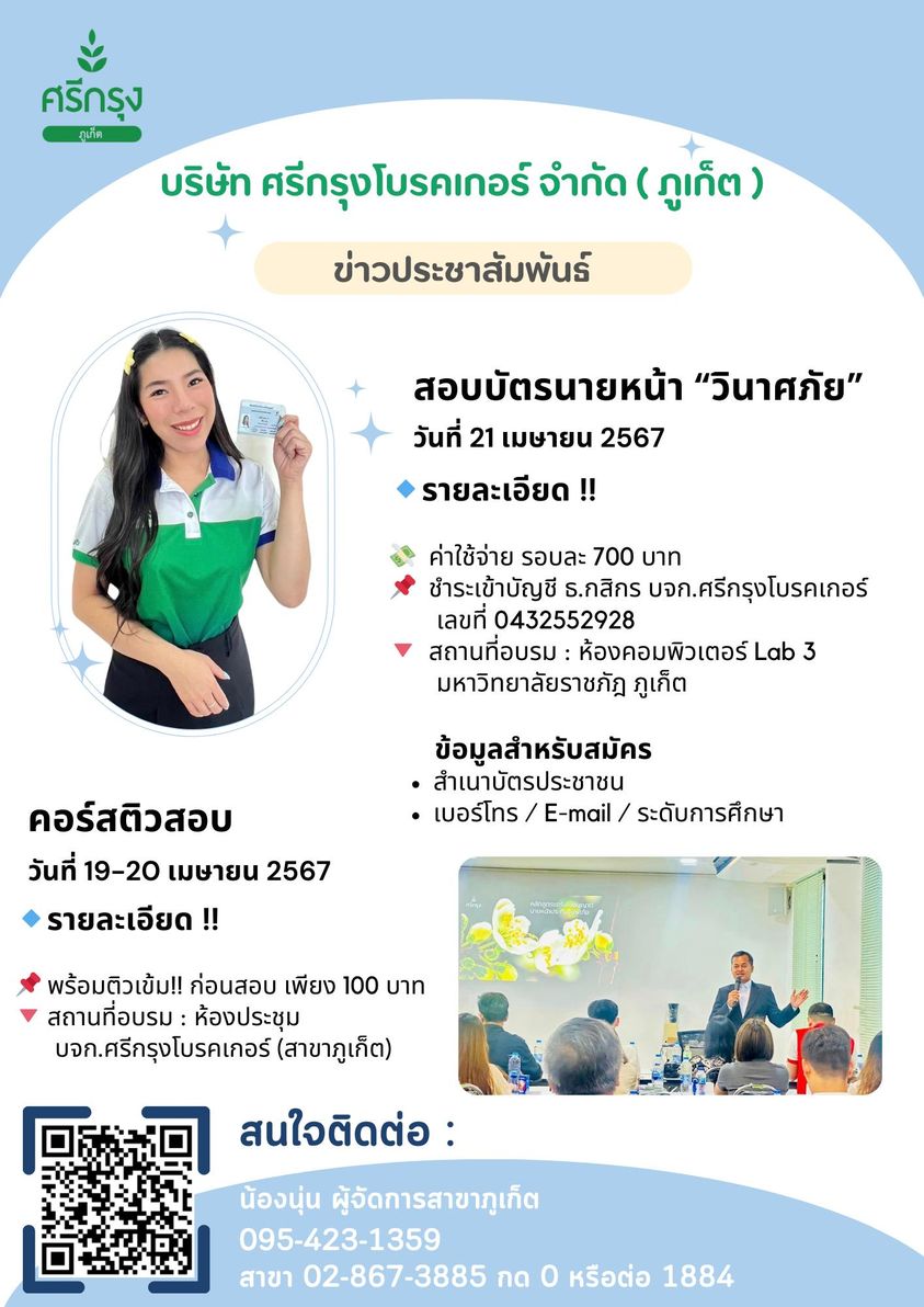ศรีกรุงโบรคเกอร์ สาขาภูเก็ต สำหรับสมาชิก ศรีกรุง ที่ต้องการ สอบบัตรนายหน้าประกันวินาศภัย