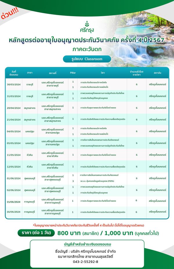 Update ตารางอบรมขอรับบัตร - ต่ออายุครั้งที่ 4 ศรีกรุงฯ ภาคตะวันตก เดือน 3-4