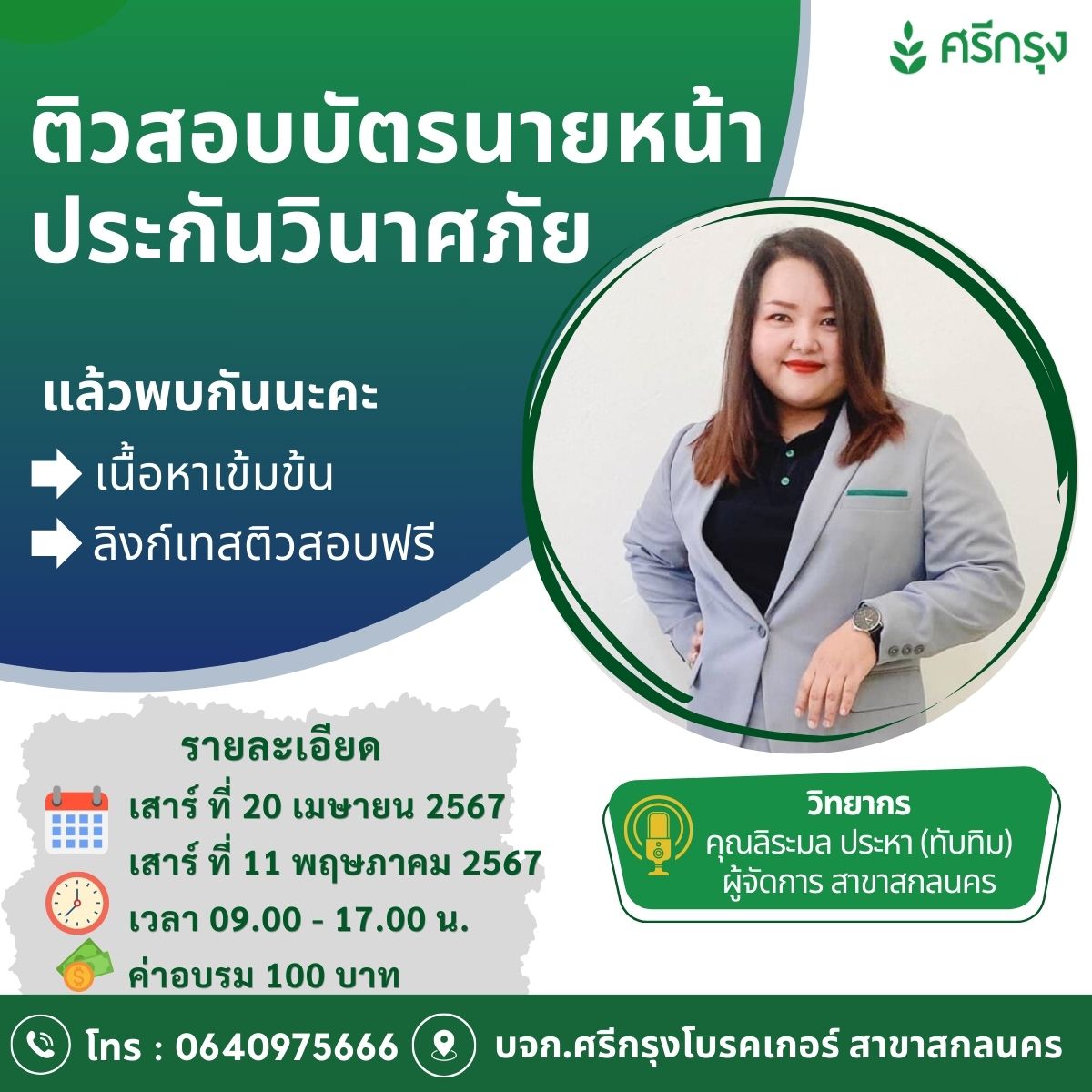 ศรีกรุงโบรคเกอร์ สาขาสกลนคร เปิดคอร์สติวสอบบัตรนายหน้า และเปิดรับสมัครสอบบัตรนายหน้าประกันวินาศภัย (รอบพิเศษ) รีบจับจองที่นั่งกันได้เลยครับ