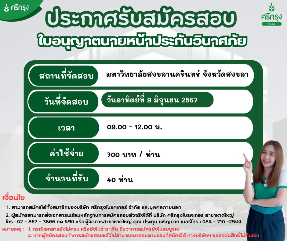 สถานที่สอบ : บริษัท ศรีกรุงโบรคเกอร์ (สาขาหาดใหญ่)