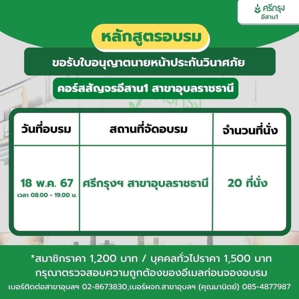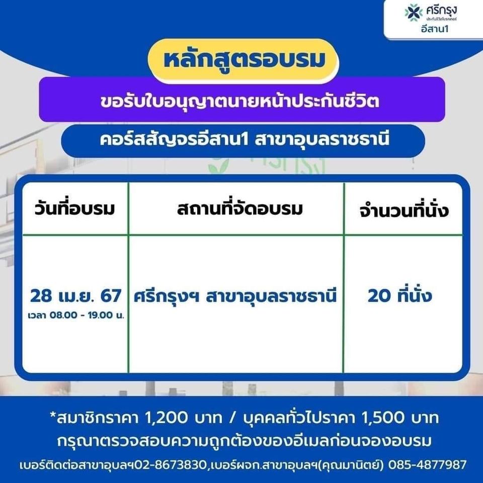 ศรีกรุงโบรคเกอร์สาขาอุบลราชธานีเปิดคอร์สอบรมเพื่อขอรับใบอนุญาตนายหน้าประกันชีวิตและนายหน้าประกันวินาศภัย