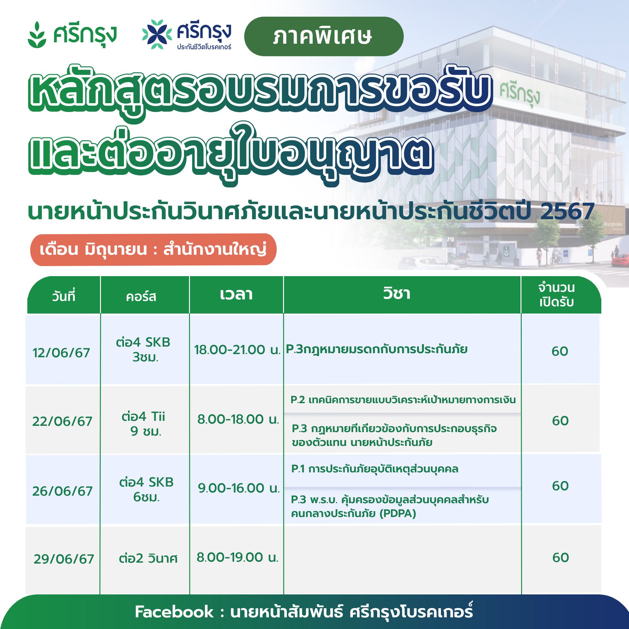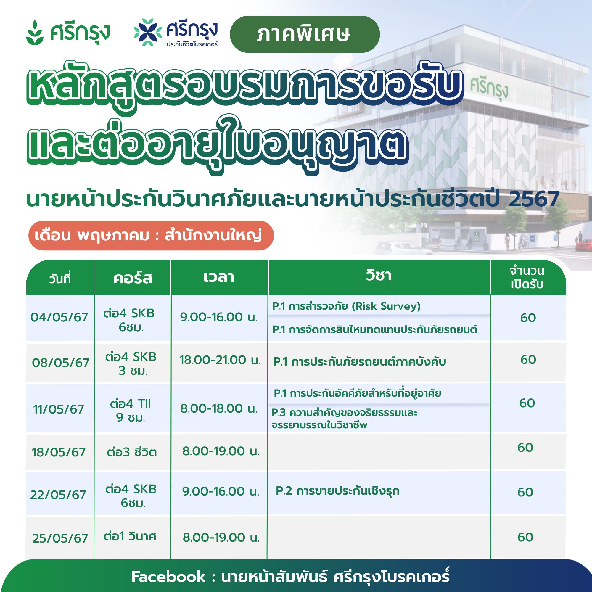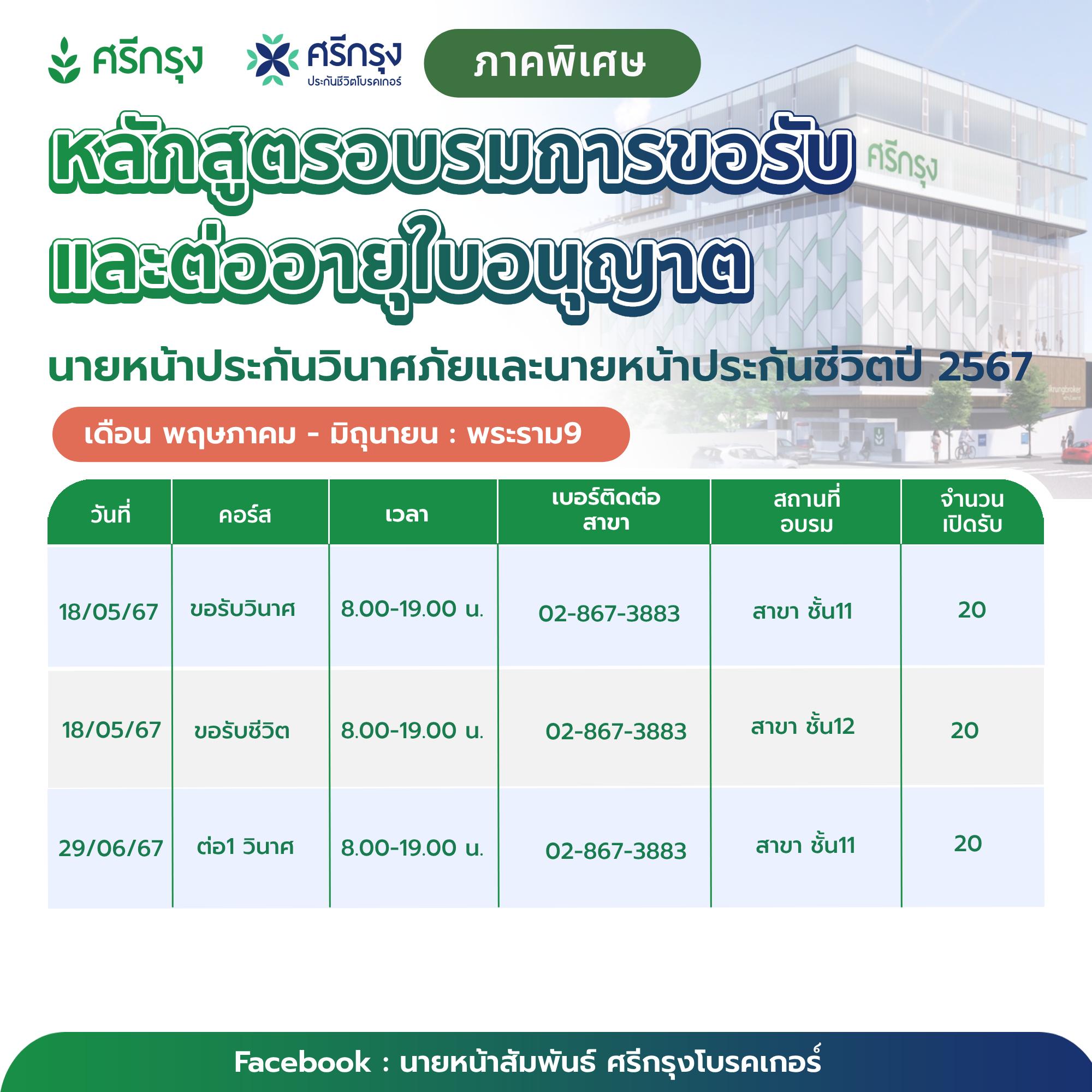 Update ตารางอบรมขอรับบัตร - ต่ออายุครั้งที่ 4 ศรีกรุงโบรคเกอร์ ภาคพิเศษ เดือน 5-6 ทั้งที่ สำนักงานใหญ่ และสาขาพระราม9 ตอนนี้เหลือว่างอีกไม่กี่ที่นั่งแล้วเท่านั้นครับ รีบจับที่จองก่อนที่นั่งเต็มน้า