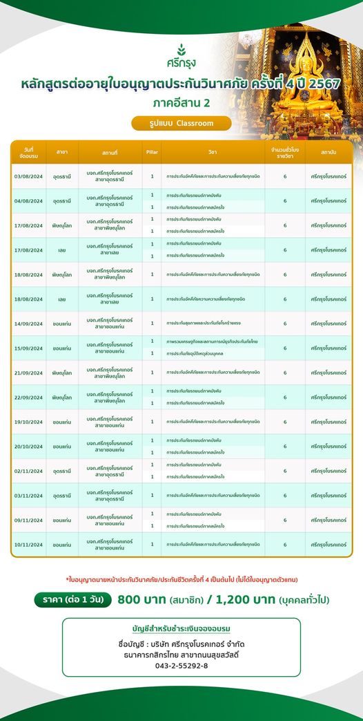 ตารางอบรมต่ออายุบัตรนายหน้าประกันวินาศภัย ครั้งที่ 4 ภาคอีสานเขต 2