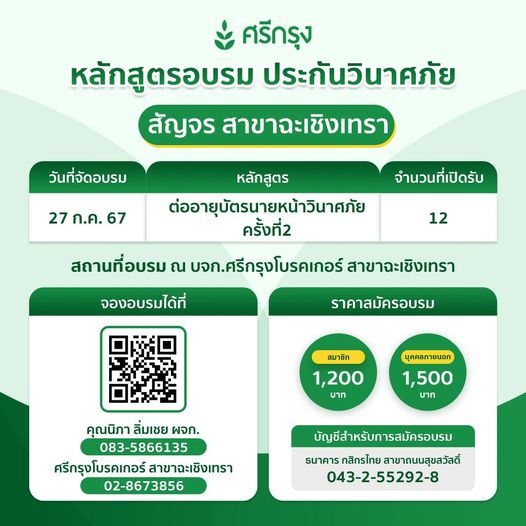 ฉะเชิงเทรามาแล้วจ้าา คอร์สอบรมต่ออายุบัตรนายหน้าวินาศภัย ครั้งที่2 ใครกำลังรออยู่รีบจอง ด่วน!!!