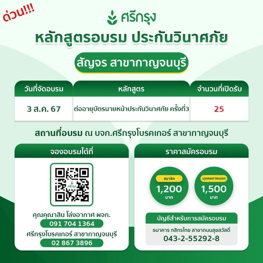 ประกาศ พี่ๆท่านไหนหาอบรมต่ออายุบัตรนายหน้าครั้งที่ 3 อยู่ ตอนนี้สาขากาญจนบุรี