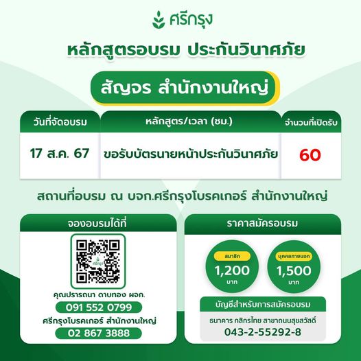 มาแล้วจ้าาา ศรีกรุงโบรคเกอร์ สำนักงานใหญ่ เปิดคอร์สอบรมขอรับบัตรนายหน้าวินาศภัยแล้วจ้า ใครสอบผ่านแล้วยังไม่อบรมขอรับบัตร รีบจอง ด่วน !!