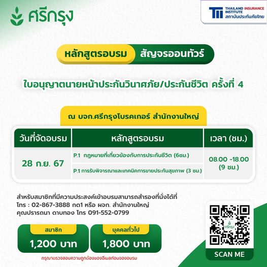 ศรีกรุงโบรคเกอร์สำนักงานใหญ่จัดคอร์สต่ออายุบัตรนายหน้าประกันวินาศภัย/ชีวิต ครั้งที่4 แบบเก็บ 9 ชั่วโมง จุกๆ ให้พี่ๆได้จับได้จองพร้อมกันแล้ว วันนี้ รีบจอง ด่วน ! !!