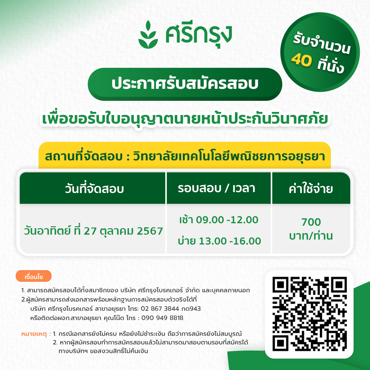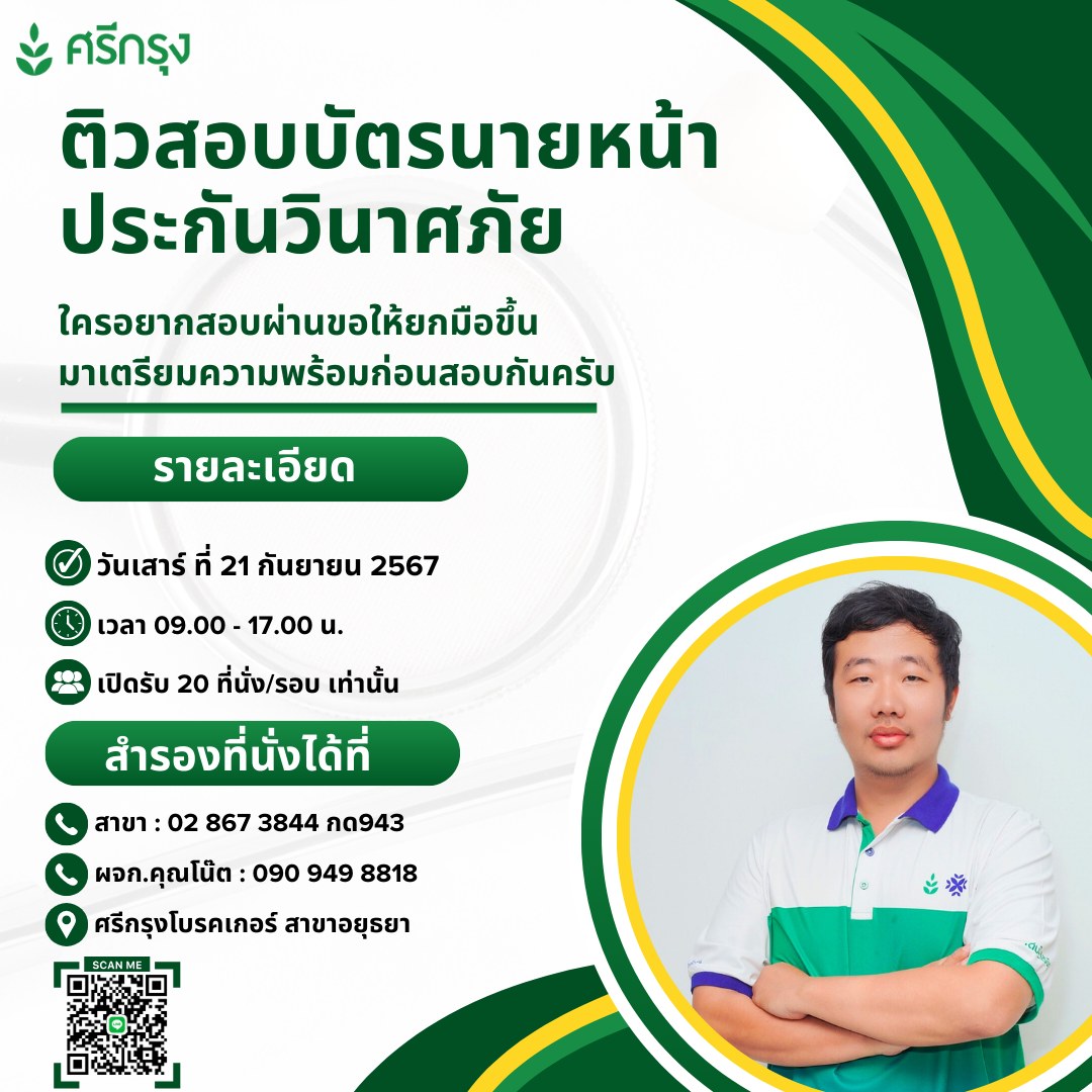 ศรีกรุงโบรคเกอร์ สาขาอยุธยา เปิดคอร์สติวสอบบัตรนายหน้า และเปิดรับสมัครสอบบัตรนายหน้าประกันวินาศภัย (รอบพิเศษ) รีบจับจองที่นั่งกันได้เลยครับ