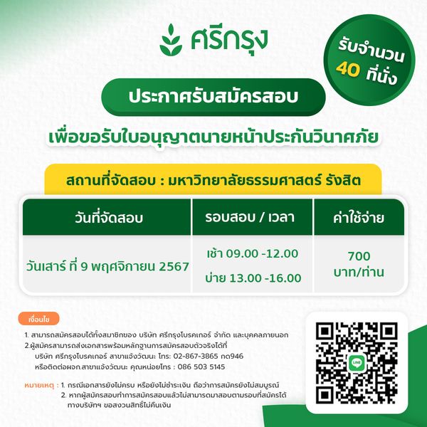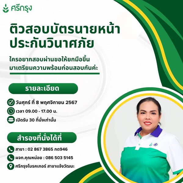 ศรีกรุงโบรคเกอร์ สาขาแจ้งวัฒนะ เปิดคอร์สติวสอบบัตรนายหน้า และเปิดรับสมัครสอบบัตรนายหน้าประกันวินาศภัย (รอบพิเศษ) รีบจับจองที่นั่งก่อนเต็มครับ