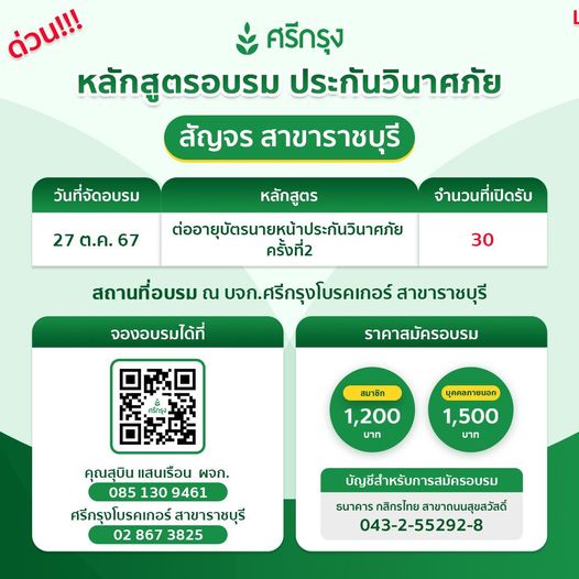 ราชบุรี มาแล้วจ้า ใครรออยู่รีบมาเลย ศรีกรุง สาขาราชบุรี เปิดให้จองแล้วสำหรับ ต่ออายุบัตรนายหน้าครั้งที่2 รีบจองด่วน! รับจำนวนจำกัดนะครับ 30 ที่นั่ง เท่านั้นนะครับ!!!
