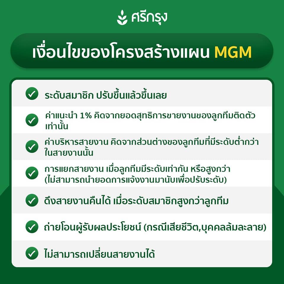 โครงสร้างตัวแทนตามแผนธุรกิจ MGM บริษัทศรีกรุงโบรคเกอร์ แต่ละขั้นของสมาชิกจะมีผลประโยชน์ต่างกัน ตามตารางแผนการตลาด และ ตำแหน่งของสมาชิก